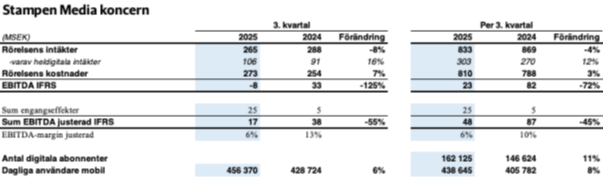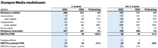 Stampen Media redovisar ett resultat på 17 (38) miljoner i tredje kvartalet. Det är en försämring med 55 % mot föregående år.